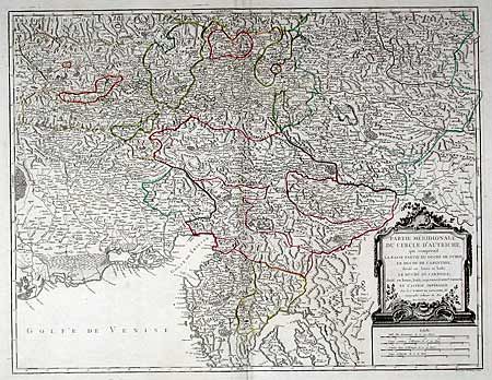 Finely and crisply engraved with large decorative title cartouche. Very detailed sheet that is centered roughly on Triste and extends in to the mouth of the Pieve River and the Gulf of Venice at the west and east to include much of Slovenia. A handsome chart with four distance scales.
