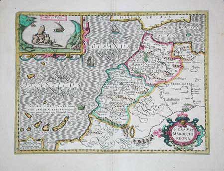 Richly embellished map of Morocco with a large inset titled "Penon de Velez" showing a fort on the Barbary coast. The map includes the Canary islands and Madera. Three strapwork cartouches complete the composition and the sea is filled with ships and a sea monster. French text on verso.
