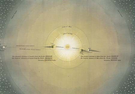 An exquisite group of prints depicting the solar system, from the view of the Holy Scriptures (plates 7 & 9) and the opposing view of Newton (plates 1 & 3). The Muggletonians were a small English religious sect that objected to "modern" science, particularly heliocentric astronomy and Newtonian physics. Founded in the 1650's by two cousins who received "messages from God" that they were God's chosen witnesses prophesized in the Book of Revelations to preach to the ungodly world in its final days. The sect lasted well into the Victorian era. Isaac Frost, a scientist and prominent member of the sect was instrumental in the refinement of the Muggletonian's geocentric astronomical theory. These charts are authentic Baxter prints, printed in color by a patented process using oil pigments. The process produced beautiful gradations of color, but was far too expensive for commercial use. These are among the scarcest of known Baxter prints, as they were meant to be circulated only among sect members. In addition to the scarcity, they are important documents in the history of the relationship between religion and science.