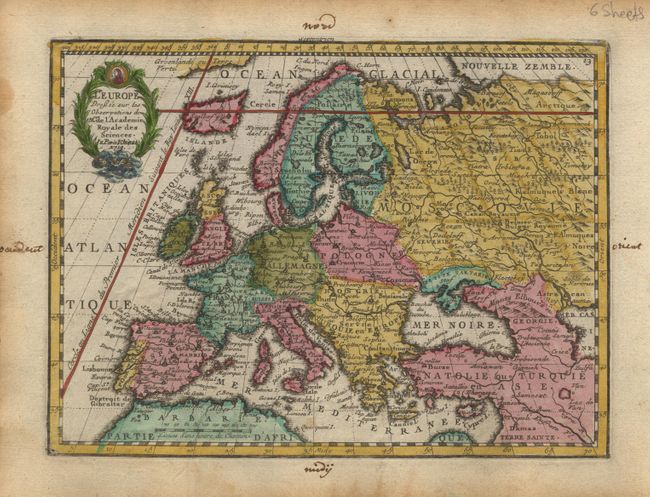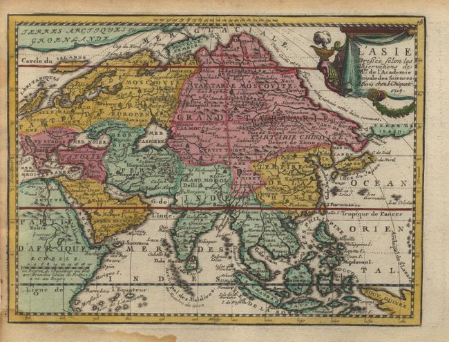 Charming set of small maps. The double hemisphere world and the North American map feature the Island of California. In Asia and the Pacific, Australia is incompletely mapped and still connected to New Guinea and only the western coastline of New Zealand is shown. Remnants of Terres Australes are still shown and in the Arctic there is a Northwest Passage linking Hudson's Bay with D. d'Anian. Both Africa and Asia conform to the standard French geography of the period. Each map is embellished with a decorative cartouche and the American maps are further decorated with ships and sea monsters.