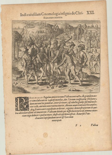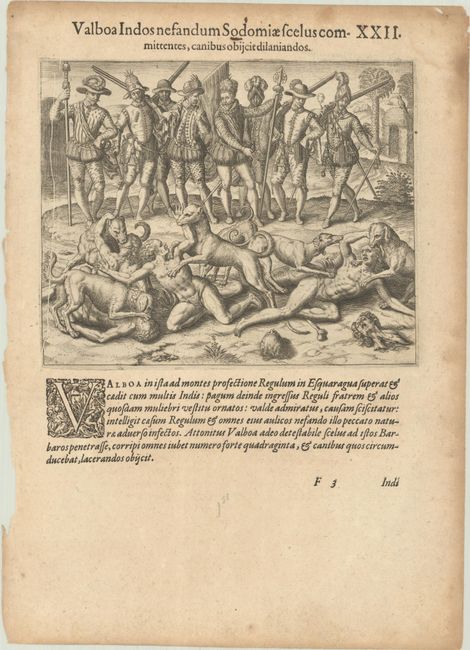 This striking pair of engravings are Plates XXI and XXII from Part IV of de Bry's Grands Voyages. Although the first engraving is centered on Vasco Nunez de Balboa and his soldiers quarreling over a pile of pearls and gold, the real attraction is at top left, where the Indigenous people of the Darien are pointing to the Pacific Ocean. Balboa, who had become Governor of Veragua (the Spanish colonial territory in Central America) in 1513, led an expedition from Santa Maria on the northern coast of Panama to the South Sea (the Pacific Ocean) in search of gold. On September 25, 1513, Balboa viewed the Pacific for the first time from the summit of a mountain, and is credited with being the first European to sight the ocean. The brutal second engraving shows Balboa's dogs massacring 40 Cueva peoples for what he perceived to be their deviant sexuality. From the first Latin edition, published 1594. On a sheet of Latin text measuring 9.7 x 13.5".