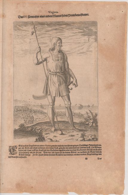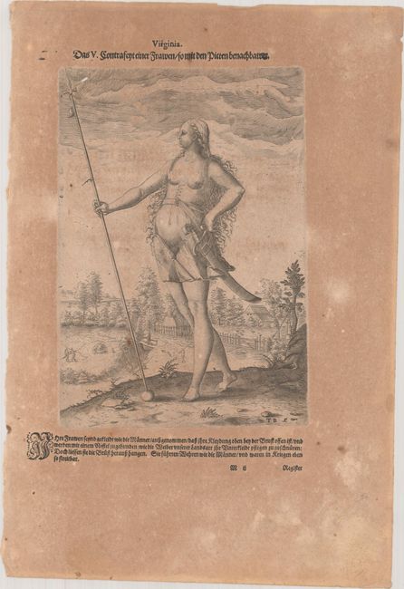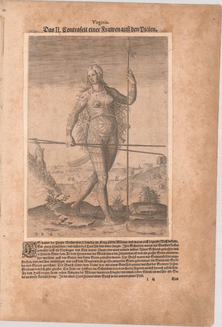 This uncommon group of engravings illustrate members of the ancient Pict tribe of Britain. The first plate is that of a Pictish warrior, with an elaborately painted or tattooed nude body, clutching the decapitated head of an enemy while another head rolls at his feet. The following two plates are of the Pictish women, one older, the second her daughter, both with intricate body ornamentation, as well as weaponry. The fourth plate shows a man of a neighboring tribe, wearing a tunic and lacking the body decorations, with the coastline in the background. The last plate depicts another female Pict, without ornamentation, holding a spear. All plates have German captions at bottom, and the title page to this section of Picts is included. The Pict plates were engraved by Theodore de Bry, whose initials "T.B." appear at the bottom of each plate, and were based on watercolors by Jacques le Moyne. De Bry included the Pict plates in his Grands Voyages to serve as a point of comparison to the Virginia Natives illustrated throughout Part I.