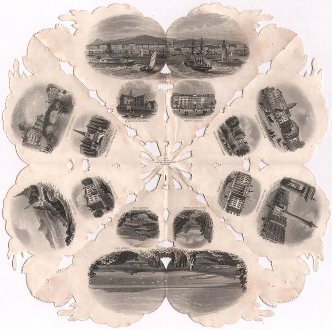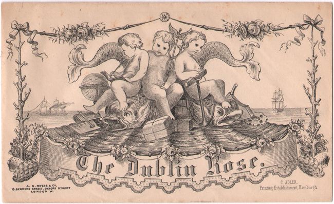 This fascinating and unique souvenir folds into a delicate rose, and when unfolded it depicts steel engravings of famous buildings and sights in Dublin, Ireland. The 12 large and 14 small vignettes include Dublin Bay, Kingstown, Nelson's Pillar, the Four Courts, Trinity College, St. Patrick's Cathedral, Castle Yard, and the Custom House, among others. The "Dublin Rose" was part of a series created by Joseph Myers in London, England that represented dozens of European cities, as well as New York, Canada, Montreal (two editions), Havana, and Melbourne. When folded, the rose fits into a small printed envelope with three putti holding an anchor, a caduceus, and a notebook, sitting atop sea monsters, along with the title, "The Dublin Rose." Printed by C. Adler in Hamburg and published by A. H. Myers & Co. in London.