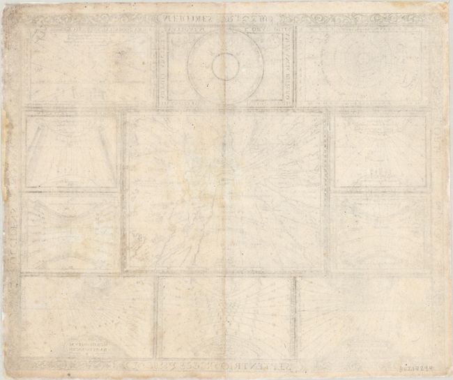 Surrounding the central map are ten horological diagrams, all enclosed in a decorative border. These diagrams include a windrose at top center (bearing the date Anno MDCVII), signs of the zodiac, and sundials for morning, midday and evening hours. The plate was designed for Ritter's first edition of the Speculum Solis in 1607, and is a synopsis of all the plates that appear in his later editions. This is the second state.