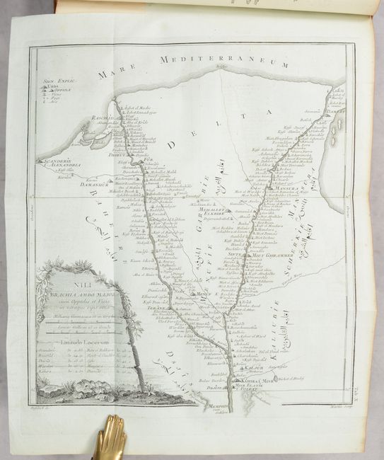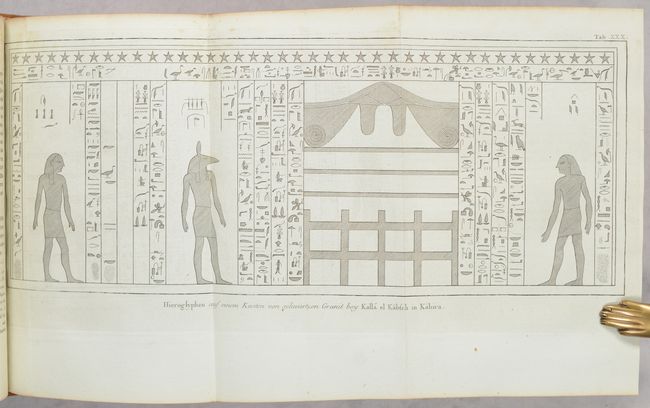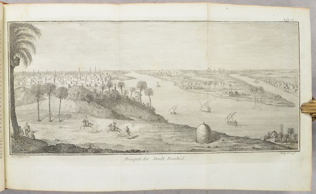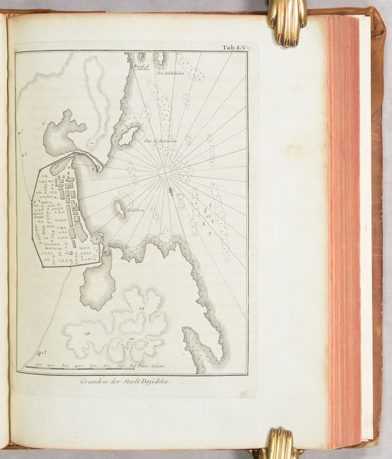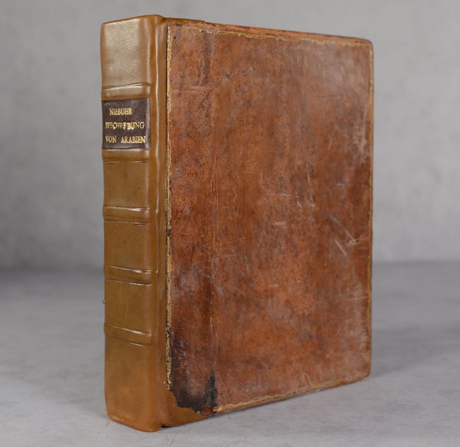 This is the complete first volume of Carsten Niebuhr's ground-breaking Reisebeschreibung nach Arabien. The German cartographer and explorer Carsten Niebuhr was the sole survivor of the six-man Danish Arabia expedition (1761-67). Upon his return, he wrote four books on his discoveries: Beschreibung von Arabien (1772) and the three volumes of Reisebeschreibung nach Arabien (Vol. I - 1774; Vol. II - 1778; and Vol. III - posthumously published in 1837). According to Ankary, "Niebuhr's expedition clearly represents a radical turning point in the way of studying the Arabian Peninsula and drawing maps of it." Indeed, his work deepened the European understanding of the region, and his maps set the groundwork for further scientific mapping. This volume covers the first couple years of the expedition, with stops in Constantinople, Alexandria, Cairo, Sinai, Jeddah, and around Yemen. The volume features 15 maps and plans on sturdy bluish sheets, including one large folding map, Tabula Itineraria Sistens Illam Partem Terrae Yemen... (15.6 x 18.4"). It covers the coast of Yemen from Loheaia (Al Luhayyah) south to Mocha, and spans inland to Damar (Dhamar). It also identifies several other towns and cities, including Sanaa and Hodeida (Al Hudaydah), locates the island of Kamaran, and features remarkable topographical detail. In addition to the maps and plans, there are 58 engravings showing views, local culture and dress, hieroglyphics, and more. German text. Published in Copenhagen by Nicolaus Moller. 506 pages. Rebacked in leather over contemporary leather boards.