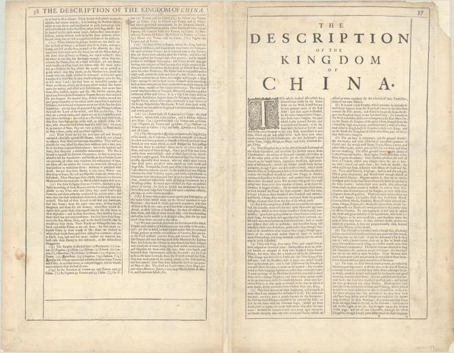This superb map of China, Korea, and Japan is the only carte-a-figures map made of the region. The Great Wall protects the Kingdom of China from a variety of evil creatures that occupy The Desert Lop, and the rest of the kingdom is delineated by a long range of mountains in the west that separates it from The Kingdome of Bramas. Korea is a long island and Japan is presented on the Ortelius-Teixeira model. The decorative panel at top features bird's-eye plans of Macao (copied from De Bry) and Quinzay (Hangzhou) along with scenes depicting ingeniously crafted wind-carts and their manner of execution (crucifixion). The inhabitants of the region are shown at sides, including a very early depiction of a Japanese soldier. There are interesting notes throughout the map on various historical and mythical aspects of the region, including where men are seduced by wonderful illusions and where fireproof cloth is woven. The English text on verso provides an equally fascinating description of Chinese culture. Dated 1626 in the cartouche and published circa 1676 with the imprint of Basset and Chiswell at bottom right.