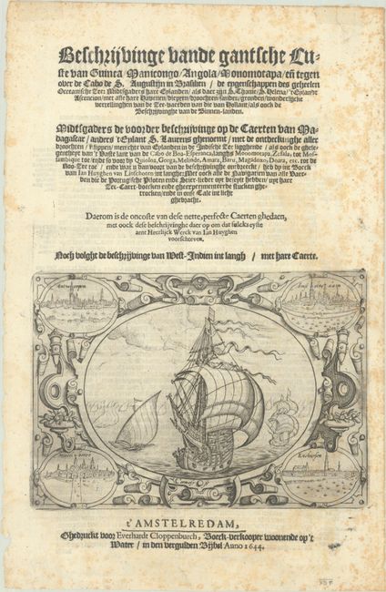 This title page is centered on a beautifully rendered sailing ship in an elaborate strapwork cartouche that contains four views of major cities in the Dutch trading empire: Antwerp, Amsterdam, Middelburg, and Enkhuizen. Linschoten was an important Dutch explorer. The valuable sailing instructions that he managed to acquire from the secret Portuguese archives helped launch the Dutch trading empire in the East Indies. His travel writings, the famous Itinerario, published in three parts (Description de l’Amerique, Le Grande Route de Mer, and Histoire de la Navigation), was one of the most important early accounts of India, the Far East, Portuguese Africa, and the New World. This is from a Dutch edition with the publisher's imprint "Ghedruckt voor Everhardt Cloppenburch, Boeck-verkooper woonende op't Water / in den Vergulden Bijbel Anno 1644." On a sheet measuring 8.0 x 12.3".