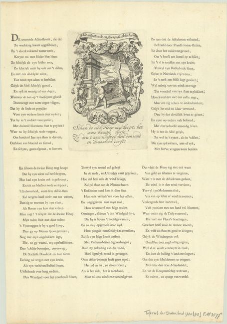 This engraving is from the important account of one the most infamous financial meltdowns in history, known as the Mississippi Bubble incident. This engraved view depicts a dying tree, representing trade, with a putto holding an anchor in front of a palatial house. There are columns of verses in Dutch flanking the scene, printed from a separate plate. The overall message was that the economy was destroyed due to excessive speculation on the stock market. The full sheet with Dutch text measures 11.1 x 16.3".
