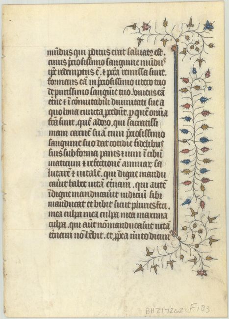 A nice vellum manuscript from a French Book of Hours, in the style of a Rouen scriptorium. Written in brown ink, the leaf has a decorative panel in the margins with ivy and flowers on both sides of the leaf.