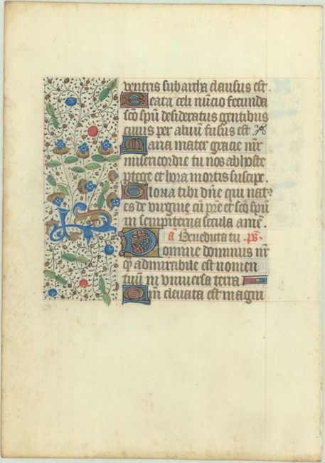 Superb vellum leaf from a French Book of Hours. The text is in a bold gothic book hand with nine illuminated initials and five line fillers. Both sides include fine floral and vine panels painted in a multitude of colors and gold leaf. The text includes a hymn and beginning with the capital "Q" at top on recto translates as: