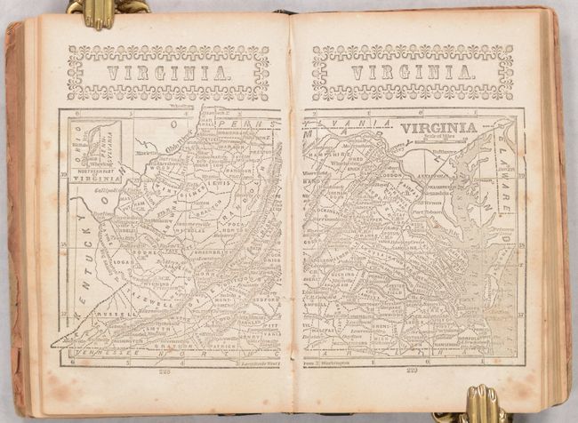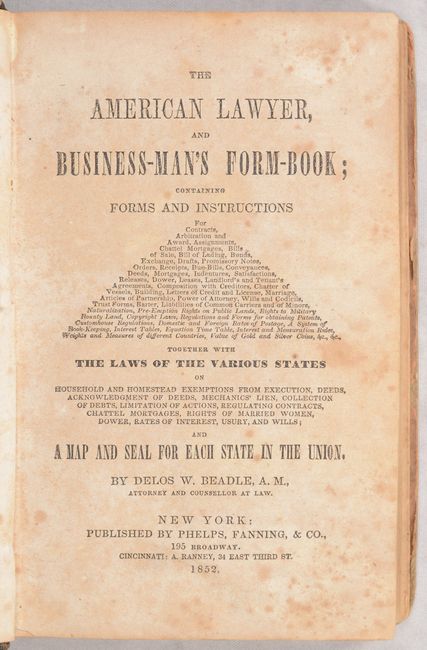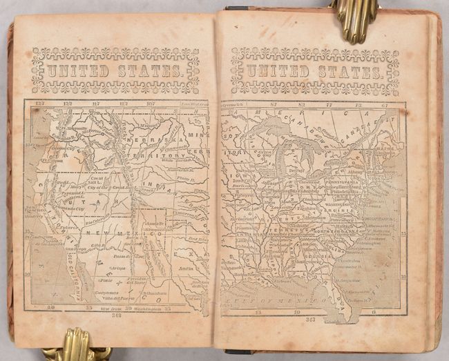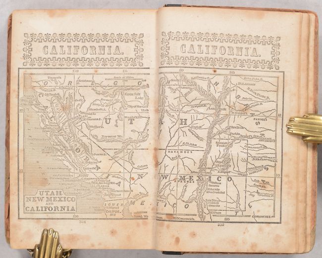 This is the second edition with an 1852 publication date on the title page. The volume features 32 double-page maps, each printed on a separate page. The map Utah New Mexico and California shows a huge Gold Region with important rivers named including the Feather and American. There are numerous other state maps, mostly from east of the Mississippi River, but also includes Louisiana and a nice Texas. The map of the United States shows Oregon Territory, a large Nebraska Territory (encompassing present-day Montana, Wyoming and Colorado), and an extremely large Indian Territory. 359 pages. Quarter-leather over pictorial paper boards.