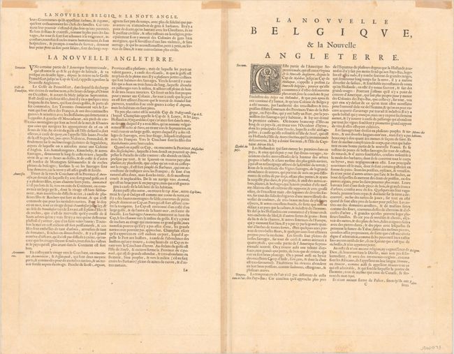 This important map, first issued in 1635, is one of the first to focus on the Dutch colony in North America and to name Nieu Amsterdam (New York). It is based on the manuscript of Andriaen Block (1614), a Dutch fur trader, who explored the area between Cape Cod and Manhattan and was the first to correctly delineate the longitudinal scale of the coastline and establish Manhattan as an island. The colony of Nieu Pleimonth is identified, as well as other English names along the coast, which were derived from Smith's map of New England in 1616. The map is oriented with north to the right and is richly adorned with a variety of wildlife, including the first appearance of beavers, polecats and otters on a printed map. Quebec is noted with a minute depiction of the fort and buildings, and the mythical kingdom pf Norumbega is noted near the R. Pentagouet (Penobscot River) in present-day Maine. A large Mohawk village is shown derived from the White-de Bry engravings. It is further embellished with a large title cartouche flanked by two natives, sailing ships, canoes, and compass roses. French text on verso, published between 1638-43.