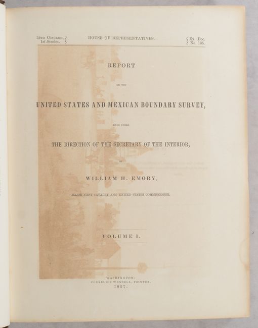This is the apparently complete House of Representatives edition of Volume 1 which is composed of two parts: Part I (258 pp. with 26 preliminary pages) and Part II (174 pp. with 8 preliminary pages). There are numerous illustrations including several woodcuts embedded in the text, 12 chromolithographic plates, 93 steel engraved plates, 3 copper engraved sections, and one large folding map:
