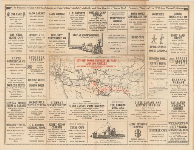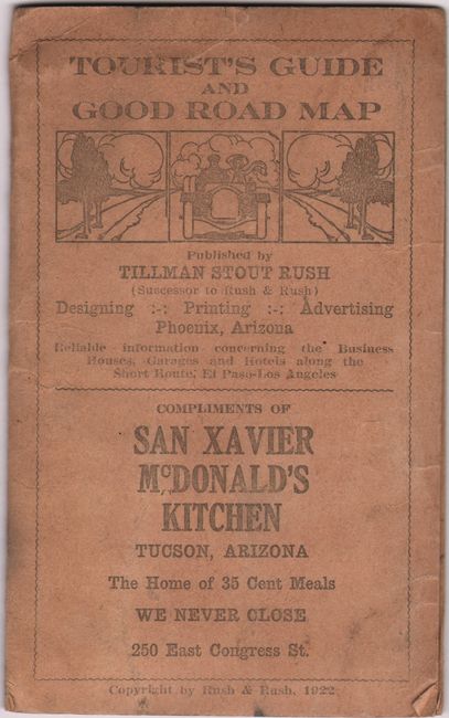 This unusual and early road map shows a "cut off" road in red overprinting extending between El Paso and Gila Bend, Arizona. While this route would no doubt save the traveler many miles over alternative routes (which were also very primitive), it required travel over rough dirt "roads" with little signage. Staying on the correct course was no easy task, and required the traveler to stop several times "to get any information and directions from our advertisers" (no coincidence there). Complicating matters, parts of the route were "passable only certain times of the year." Surrounding the small map are various advertisements, which promoted businesses that "are guaranteed absolutely reliable, and give tourists a square deal." Published by Tillman Stout Rush with compliments of San Xavier McDonald's Kitchen in Tucson. Folds into tan paper wrappers. We found no past sales records or institutional examples for this map.