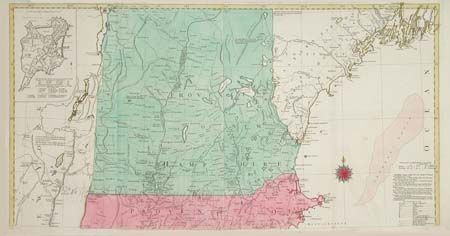 A German edition of one of the most detailed, accurate, and certainly most visually impressive, maps of New England. The map was original published by Thomas Jefferys in 1755 and is believed to have been compiled by Braddock Mead, alias John Green. The map includes two fine insets: "A Plan of the Town of Boston" and "A Plan of Boston Harbor" and a superb vignette of the Pilgrim's landing beneath the uncolored cartouche. Engraved on four separate sheets, here partially joined to form two separate sheets. Size would be 38.2 x 40" if joined.