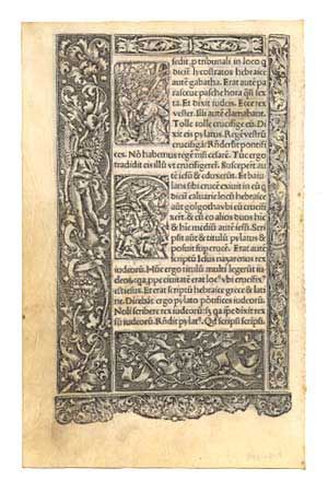 Vellum leaf from this important transitional period when books began to be printed from movable type and decorated with metal cut illustrations. Thielman Kerver was a printer in Paris, who worked "in vico sancti Iacobi/ad signum Vnicornis & ibidem venales habent" (in Saint Jacob's lane in the sign of the Unicorn where they are also for sale). The text is from the Hours of the Cross, the Passion of Our Lord, St. John 19:5. Within the text are three pictures, related to the story, while the decorations in the margins are not related.