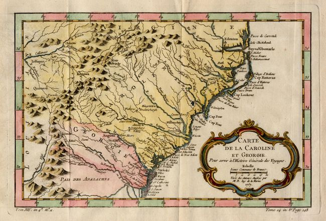 Delicately engraved map of the colonies from Albemarle Sound to the Alatamaha River. It probably owes its origin to the 1752 map of the region by Emanuel Bowen. Numerous English settlements along the coast and Indian villages throughout, including a number west of the Appalachian Mountains. There is more detail in the area west of the Blue Ridge than in many other maps of the period. Decorative title cartouche.