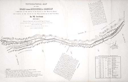 From the field notes and journals of Capt. J.C. Fremont and from sketches and field notes made on the ground by his assistant Charles Preuss. Each is section is about 26 x 16". Together the seven cover the region "commencing at the Mouth of the Kansas in the Missouri River, and Ending at the Mouth of the Wallah Wallah in the Columbia," thus the Oregon Trail Route. Topography is in more detail than in Fremont's parent map. Each sheet is filled with descriptive comments from Fremont's narrative, thus providing a legitimate guide for emigrants at the time. A matching and complete set of seven scarce maps.
