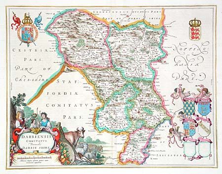Exquisite county map with Blaeu's typical fine engraving and composition, clear topographical information, as well as profuse decorative elements. Three corners are embellished with the royal coat of arms and heraldic shields of various local noblemen, and at bottom left is a delightfully illustrated title cartouche and scale featuring shepherds and their animals.