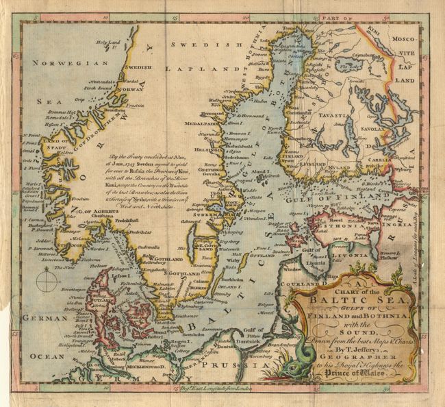 A finely executed copper engraving depicting the entire coastline of the Baltic. Explanation of the Treaty of Abo, 1743 and a decorative cartouche. Accompanied by original issue of Gentleman's Magazine dated March, 1748.