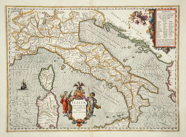 Beautiful map of all Italy, with Sardinia and Corsica but only the northern part of Sicily. The map was engraved by Jodocus Hondius, with his imprint at lower right, and published in Jansson's atlas. Embellished with a fine title cartouche attributing Philip Cluver, flanked by an angel and a soldier with putti in another cartouche framing the map key. A sailing ship and elegant calligraphy fill the sea.