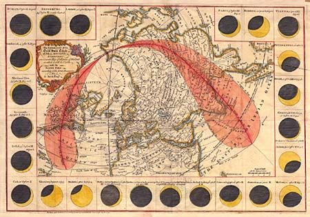 This fascinating map charts the geographical path of the solar eclipse across the Northern Hemisphere. Surrounded by 24 vignettes of the eclipse in various world cities. Decorative cartouche and titling.