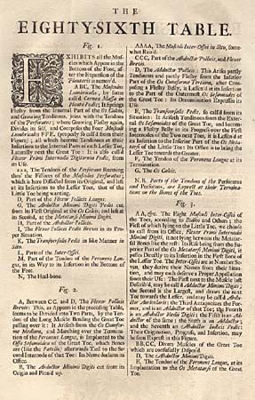 Large copperplate engraving originally appearing in Bidloo's superb atlas, one of the most striking and innovative anatomical atlases ever published. Bidloo's Anatomia with its innovative engravings by Lairesse was among the first to portray human anatomy in a naturalistic manner from actual dissections. This plate features the muscles of the foot. Complete with the accompanying text leaf describing the plate. Such realistic detail was not seen again in anatomical illustration until the beginning of the nineteenth century. It is from the second edition issued in English by Thomas Cowper from the plates he purchased from Bidloo.