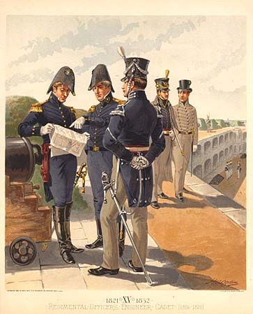 Fine collection of beautifully rendered and colored scenes of military men and officers. Lot includes: Infantry & Musicians, 1796; Continental Army, 1776; Infantry Dragoons, Full Dress, 1835; Regimental Officers, Engineer, Cadet, 1821; Dragoon, Artillery, Campaign Uniform, 1841; Rifle, Dragoon, Cadet, 1813; and Infantry, Artillery, 1802. A very lovely collection of chromolithographs printed by the G.H. Buek & Co. of New York.