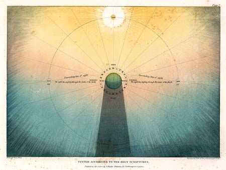 Beautifully designed Baxter print charting the solar system, from the view of the Holy Scriptures. Shown is the Sun on its track around the Earth on its mission of rising and setting. The times of day are noted in Roman numerals around the planet. One of the lovlier Muggletonian piece, with colors mimicking sunset and sunrise. Engraved by W. P. Clubb & Son.