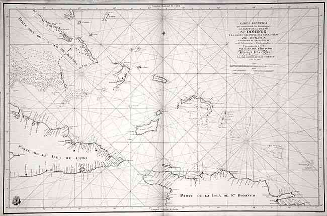 Large and rarely seen Spanish chart of eastern Cuba, northwest Hispaniola and the lower Bahamas including the Turks & Caicos Island. Good detail of navigational hazards, soundings and with many place names along the coastlines. Filled with rhumb lines and some soundings. Very nice lettering in title.