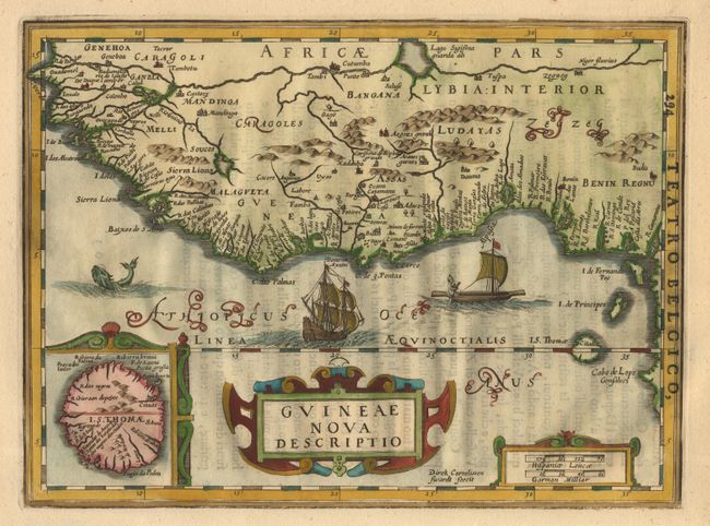 Miniature map based on Hondius' folio map of the same title. The map shows the West African coast from Senegal to Cape Lopez on the Gulf of Guinea just below the equator. The island of Sao Tome is shown in detail in the small inset bottom left. The map was engraved by Direk Cornelissen Swardt and is nearly identical to the one he engraved for Cloppenburgh's edition of Mercator Atlas Minor except the moiré pattern in the sea around the cartouches has been eliminated. 294 - Teatro Belgico is overprinted in right border. Italian text on verso.