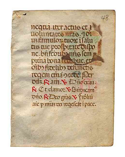 A beautiful vellum leaf from a tiny Italian Book of Hours. The large initial "D" is decorated in many colors and burnished gold leaf with a flower inside the initial. The text is in a fine Renaissance letter type. The text is from the Hours of the Virgin, Prime.