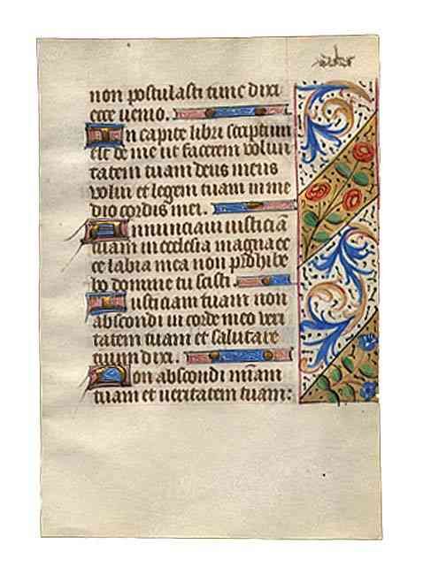 Fine vellum leaf from a French Book of Hours. Both sides are decorated with panels of flowers and acanthus leaves and filled with numerous illuminated initials and line fillers painted in red, blue, white and gold. The text is in a neat gothic bookhand in black/brown ink and is from Psalm 39:7.