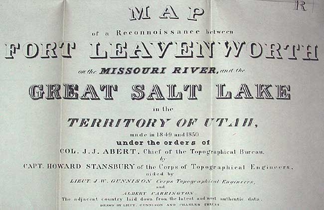 Made under the orders of Col. J.J. Albert, chief of the Topographical Bureau, by Capt. Howard Stansbury of the Corps of Topographical Engineers, aided by Lieut. J.W. Gunnison and Albert Carrington. Drawn by Lieut. Gunnison and Charles Preuss. Thus bringing together some of the most important names in Western cartography. This immense map covers the Great Plains, Colorado, Wyoming and Utah in considerable detail on a scale of 1" to about 16 miles. The detail is particularly evident in present-day Colorado, the Laramie Mountains (here labeled Black Hills), and in the vicinity of Salt Lake. Wheat devotes more than eight pages of text to this map, calling it "one of the most important [maps] of its decade, bringing permanently into Western cartography a number of outstanding details." Lithographed by Ackerman. Two sheets joined and folding, as issued.