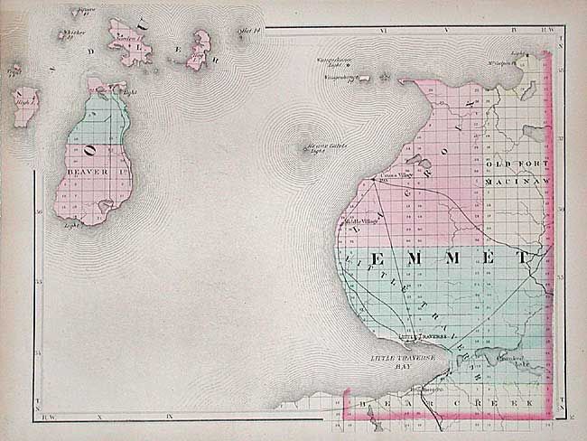 Hand colored by townships, of which there are only 4, and showing offshore islands of High, Beaver, Garden and Hog. Includes the region around Harbor Springs and Petoskey, here Bear River P.O. Railroad extends to about the location of today's Petoskey State Park. Cheboygan County on verso.