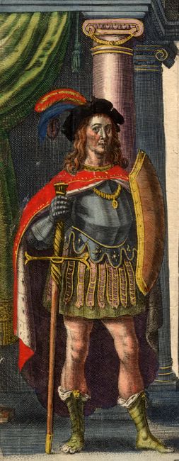 Attractive title page with the figures of a musketeer and the French Queen flanking the title. The queen is holding the national flower and her skirt is decorated with fleur-de-lis, all highlighted in gold leaf. At top two putti display the coat of arms that is draped in a fruit and vine garland. The title is engraved on a separate sheet, as was common practice for publishers during this period.