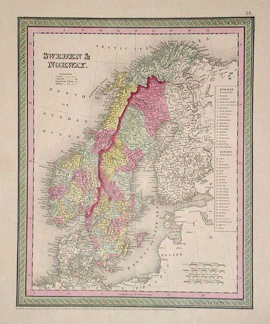 Very finely and precisely engraved with much detail throughout. Table at right gives the Districts and Prefectures for Norway and Sweden. Decorative borders.