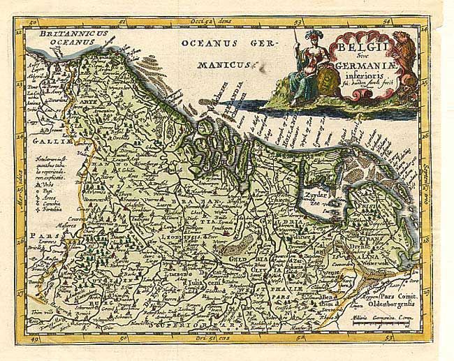 Fine little map of Holland and Belgium based on Hondius' map of the Low Countries. The title cartouche is engraved onto a clamshell and is flanked by an allegorical woman and a lion.