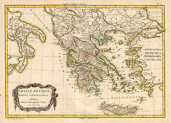 An attractive map of ancient Greece extending to include the boot of Italy and coast of Turkey with less detail. Ornamented with a flower-garland draped title cartouche.