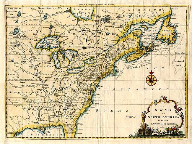Fine small map showing the colonial possessions in North America with early western settlements, forts, Indian villages and tribal territory. The colonies are shown with their boundaries extending past the map's western border. Various treaty and charter boundaries are shown. Earl Granville's Property stretches from the Atlantic west to beyond the Mississippi River. The fishing banks off Canada are prominently noted. Delicate title cartouche and compass rose. First state.
