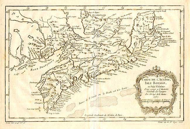 Strongly engraved chart with decorative rococo-style cartouche. Shows in good detail Prince Edward Island, here called Isle Saint Jean, and covers all of Nova Scotia including Cape Breton. Locates numerous banks south of Nova Scotia.