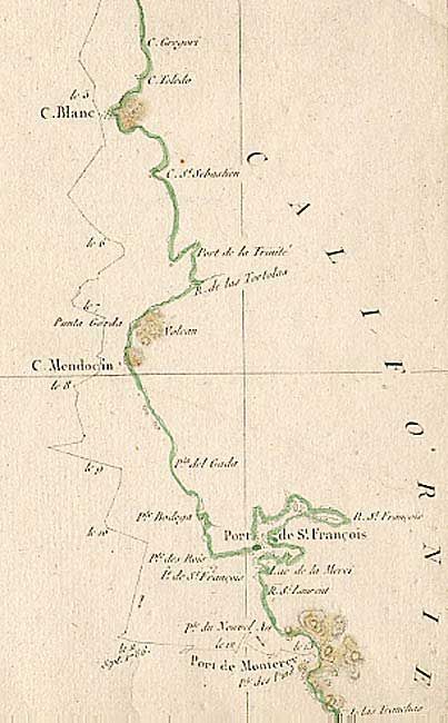Superb large-scale map of the West Coast from Monterey California to Mount St. Elias in Alaska depicting the route of the voyage with only those parts actually surveyed. Puget Sound is conspicuously missing. Jean-Francois de Galaup, Comte de La Perouse commanded a French scientific expedition to the Pacific in 1785-88. Recognized as one the foremost naval commanders and navigators in France, he was selected by King Louis XVI to complete Captain James Cook's exploration of the western Pacific. La Perouse explored the coasts of the Gulf of Alaska and northwestern North America in search of the fabled Northwest Passage. After leaving America his expedition continued on to Asia where he explored from Kamchatka to Macao and the Solomon Islands in the South Pacific. His expedition vanished shortly after leaving Botany Bay, Australia, in 1788.