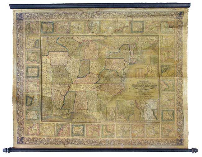 Very fine wall map drawn by J.H. Young and engraved by J.H. Brightly. A remarkable map that extends into Texas, Indian Territory, and Minnesota with a large unorganized area to the west labeled Dacotah or Sioux. Large insets within the map include the State of Texas and another of Oregon Territory. The map is very detailed with hundreds of place names, plus roads, villages, railroads, ports, etc. A table gives the 1840 population of 120 cities and another gives the states' population of Whites, Free Blacks and Slaves. The state of New Hampshire is listed with only one slave. All surrounded by a wide decorative border, which surrounds another border composed of detailed plans of 32 important cities. An exceptional map that is in remarkable original condition. Should not be confused with the smaller (24 x 34") map of the same title.