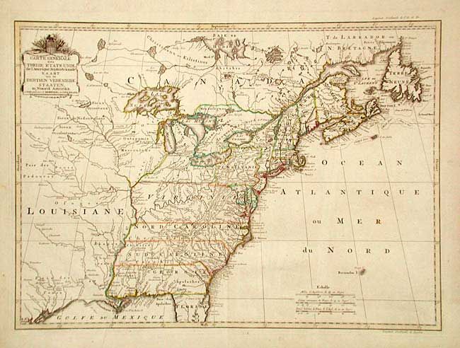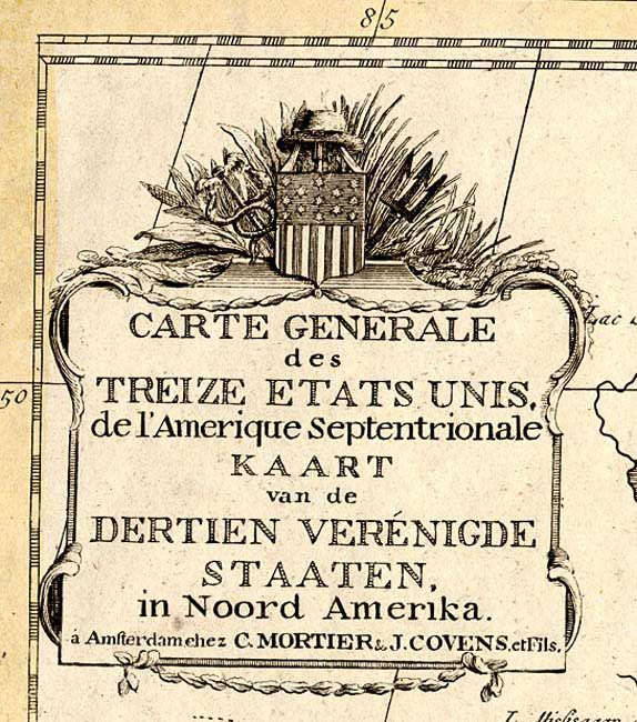 A very uncommon and handsome map depicting the recently formed United States. The title cartouche refers to the thirteen United States in both French and Dutch and is decorated by an American flag with thirteen stars; thus this is one of the earliest maps displaying the stars and strips. The area mapped is from James Bay to the Gulf of Mexico and from the Atlantic coast to central Texas. There is a fascinating road running from Port Royal along the coast to Fort George, near Penobscot Bay. Roads are not generally shown on a map of this scale at this time, making that quite unusual. Many towns, rivers and other landmarks are located, as well as Native American tribes and state boundaries, which extend to the Mississippi River. It has been speculated that Reiner & Joshua Ottens originally made the plate for this map in 1755 under the title "Carte des possessions Angloises & Francoises du continent de l'Amerique Septentrionale". It was then acquired by Covens & Mortier and reworked to show the newly formed states and may have appeared as early as 1783.