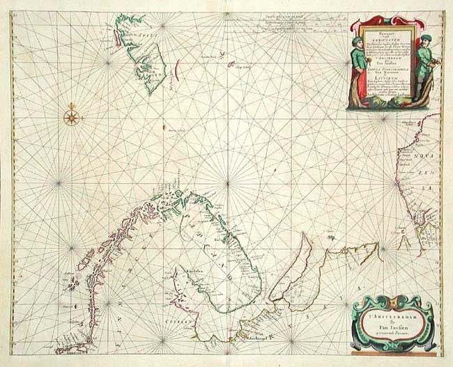 Handsome sea chart of the Barents Sea. The coastlines of northern Scandinavia, Russia, and Nova Zemla are included, as is Spitsbergen. The chart is richly embellished with rhumb lines, a compass rose and two large cartouches.