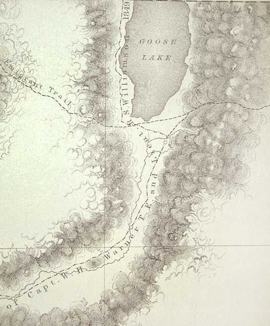 This map is quite detailed from Red Bluffs and north with place names, watershed and fine hachure in the mountainous areas. The balance of the map is mostly in skeletal format. Details the numerous explorations of the named survey crews. Locates the Emigrant Trail plus the earlier explorations of Warner and Williamson in 1849, and Wessell in 1852. Notes the place Warner was killed in 1849. An area to the west is noted as not explored "Instrumentally." Extends to show all of San Francisco Bay.