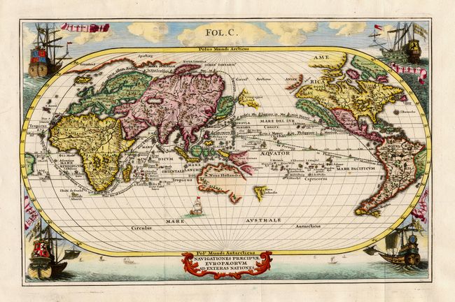 Splendid map of the world on an oval projection showing California as an Island and partially mapped Australia and New Zealand. This map is from the series produced by Scherer who was a mathematics professor and devout Jesuit. It shows the sailing routes to the East Indies across the Pacific, around the Cape of Good Hope, and (optimistically) around a Northeast Passage to Japan. The corners of the map are richly decorated with sailing ships representing the major European powers: Britain, Holland, France and Spain.