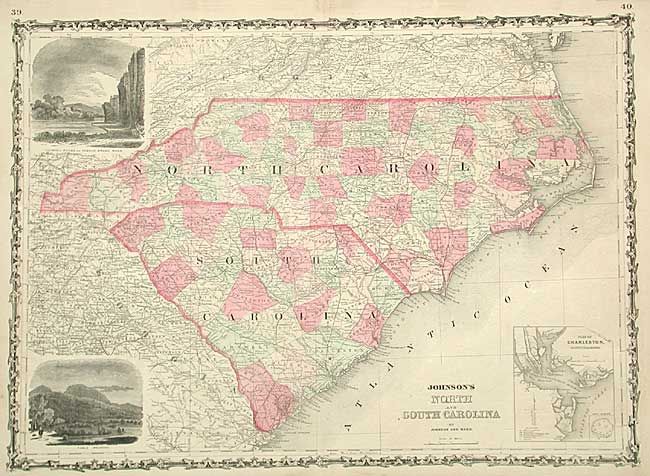 A fine example of this map from the last year it was produced as a steel engraving. Filled with details, place names, towns and railroads. Features two vignettes: Chimney Rocks and French Broad River, and Table Mountain and an inset plan of Charleston. Decorative border.