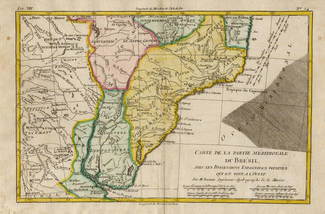 Nice matched pair of maps detailing most of Brazil. Carte de la Partie Septentrionale du Bresil covers northern Brazil, from Cayenne to just past Salvador. Carte de la Partie Meridionale du Bresil, avec les Possessions Espangnoles Voisines qui en sont a l' Ouest continues from Porto Seguro to the mouth of the La Plata River.