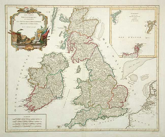 Fine map of the British Isles with a plethora of place names. Inset of "Supplement pour les Isles Orcades, Schetland et Ferro." Large decorative title cartouche engraved by Groux (state 3).